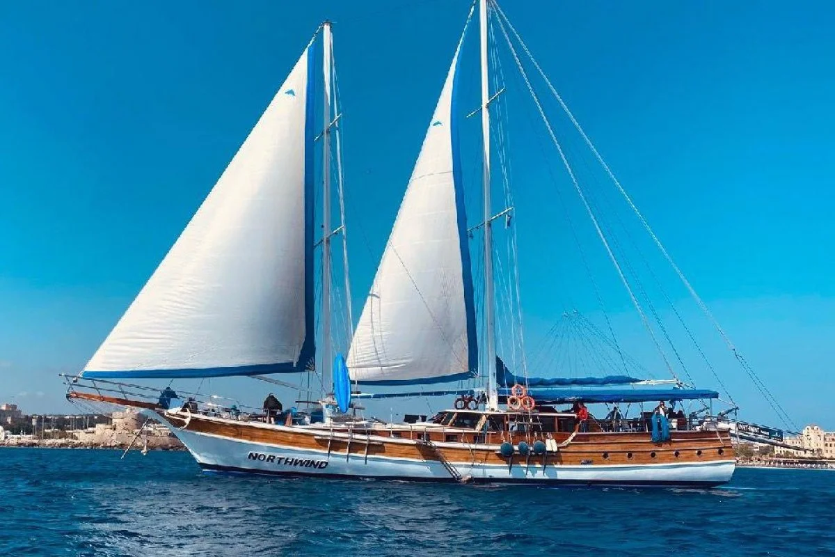Avant le lever du soleil, notre goélette mettra les voiles vers la baie de Firnaz, près de l'Aquarium ou de Kalkan. Ici, nous commencerons la journée par un délicieux petit-déjeuner et une baignade rafraîchissante.